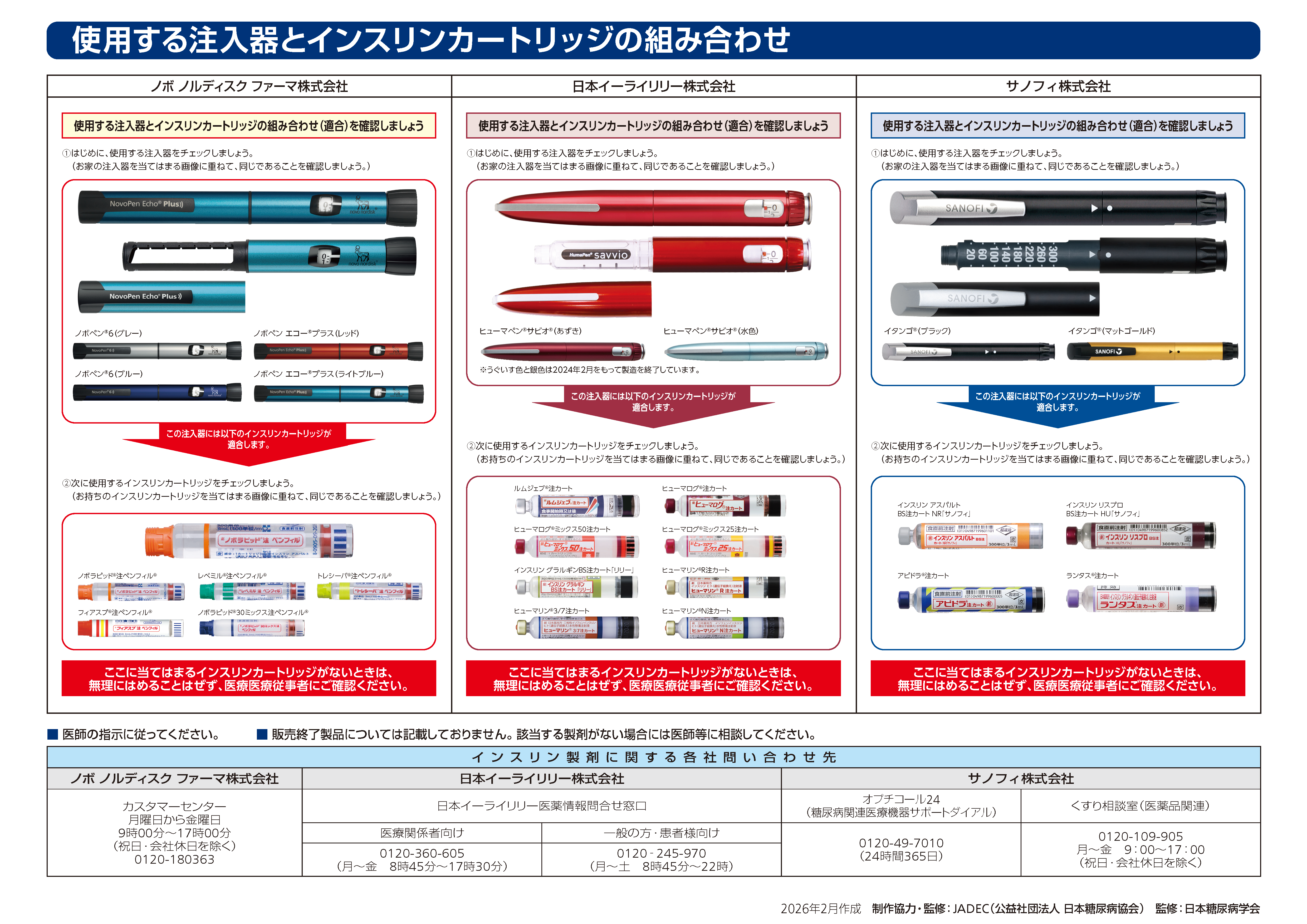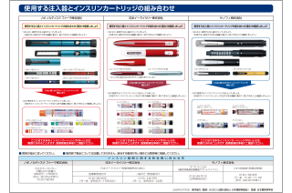 そこで、注入器とインスリンカートリッジの組み合わせ(適合)について、各製薬会社が各社製品の案内資料に、組み合わせについての共通様式の確認のページを掲載しました。また、下記の注射製剤一覧にも各社それぞれの組み合わせについての確認ページを追加しています。