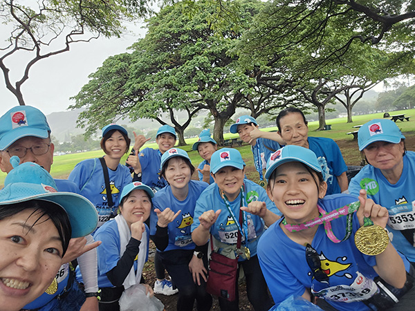 参加された皆様は、それぞれのペースで、そしてそれぞれの思いを胸に、見事に目標を達成されました。ゴール後には、雨に濡れながらも達成感に満ちた素敵な笑顔で、ダイアモンドヘッドをバックに記念写真を撮りました。